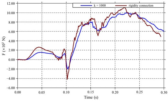 Dummy injury metrics across the seven connection stiffness configurations as shown in Table 3 revealed negligible deviation between the 1000 N/mm and rigid connection cases from Section 3.1 at 0° recline. This is attributable to the magnesium alloy seatback’s inherent energy absorption. When connection stiffness exceeds critical thresholds, its influence becomes marginal compared to material deformation as corroborated by nearly identical force–time progression patterns for both configurations in Figure 8. Subsequent analysis of lower stiffness cases demonstrated minimal head injuries at 0 N/mm with 300 N/mm ranking second. All six configurations yielded superior head protection versus 1000 N/mm. Neck injuries were minimized at 300 N/mm whereas the 1000 N/mm configuration exceeded regulatory limits of bending moment My. For chest injuries, the injury of the dummy’s chest is the least when the connection stiffness is 0 N/mm, followed by 400 N/mm. However, both of these are still slightly greater than the injury of the dummy’s chest under the condition of 1000 N/mm connection stiffness. Collectively, injury mitigation across all three body regions within lower stiffness ranges substantiates the implementation of reduced seatback-to-base connection stiffness for enhanced occupant protection.
