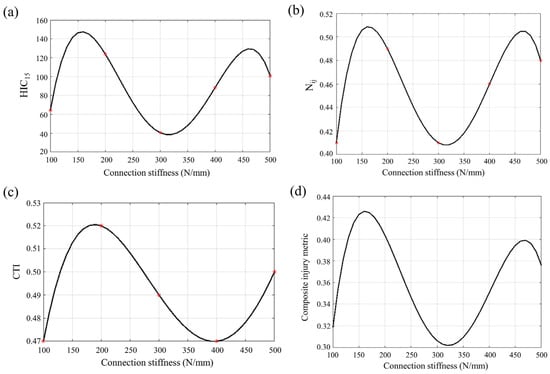 The composite injury metric reaches its minimum value at a seatback-to-base connection stiffness of 322 N/mm, as demonstrated by the response curve developed using MATLAB R2024a software and presented in Figure 9d.