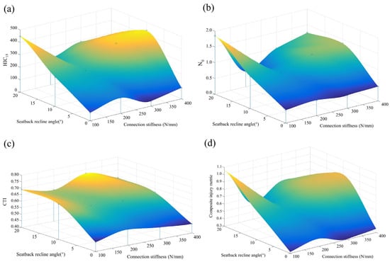 A third-order response surface model is employed to fit the relationships between the three individual injury indicators (HIC15, Nij, CTI) as well as the composite injury metric F, the seatback-to-base connection stiffness, and the recline angle. The third-order response surface model was constructed using MATLAB’s griddata function with cubic interpolation, which ensures exact passage through all sampled data points, theoretically achieving zero error at those locations. The weighting factors f1, f2 and f3 is assigned as a set of 0.4, 0.35, and 0.25, respectively.