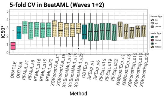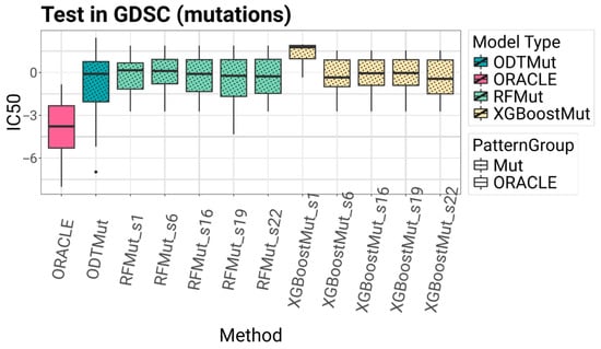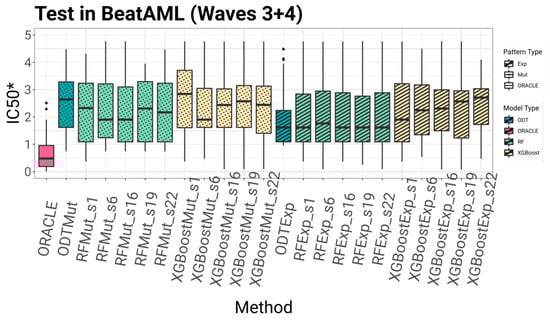 External validation using the GDSC dataset is presented in Figure 7. Among all models, ODTMut and XGBoostMut_s22 achieved the lowest mean IC50 values of −0.966 and −0.457, respectively. For XGBoost, the application of the SEATS method had a notable impact, as the model without SEATS yielded a substantially higher mean IC50 of 1.3, a difference that was statistically significant (Wilcoxon p-value = 2.23 × 10−3). The best-performing Random Forest model, RFMut_s19, achieved a mean IC50* of −0.426, compared to −0.146 for its counterpart without SEATS; however, this difference was not statistically significant. Despite inherent differences in experimental protocols and measurement platforms between GDSC and BeatAML2, the results demonstrate the robustness of the models and highlight the substantial contribution of the SEATS method.