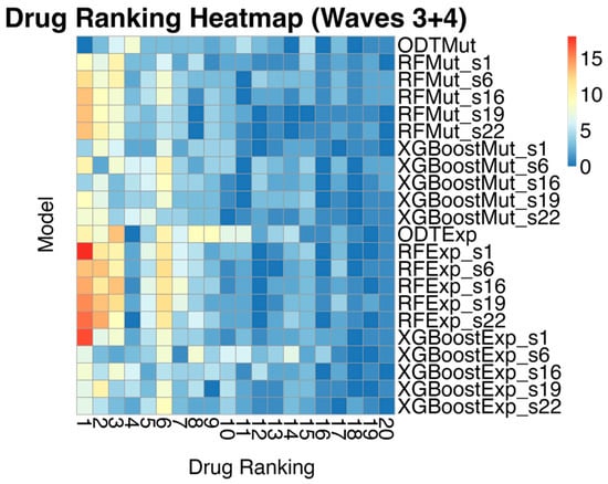 Heatmap of Drug Selection Frequencies for Waves 3 + 4. This heatmap illustrates the frequency with which each model’s top prediction corresponded to the oracle’s ranked drugs (where Rank 1 is the best drug). Warmer colors indicate higher frequencies of selection, highlighting the model’s ability to consistently identify the most effective drugs.