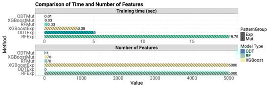 Comparison of Model Training Time and Feature Utilization. The top panel displays training times for various models (ODT, RF, XGBoost) using expression (Exp) and mutation (Mut) data. The bottom panel shows the number of features used by each model type. Patterns and colors differentiate between data types and model.