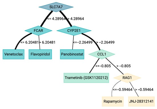 Interpretability was another domain where the ODT approach excelled. As shown in Figure 9, the ODT structure allows clinicians to follow a clear decision path, linking specific biomarker thresholds to drug recommendations. This transparent structure can be directly translated into a visual decision aid, supporting clinical adoption. In contrast, the decision-making process of RF and XGBoost models is less transparent due to their ensemble nature. Nonetheless, these models can still provide biologically relevant insights through feature importance metrics. Tree-based models provide intrinsic importance measures—Gini index for Random Forest and Gain factor for XGBoost—which we report in Figure 10. SHAP values are also a valid measure to explain the model. One key difference between SHAP and tree-specific feature importance methods is that the SHAP values are computed for a specific prediction. The overall importance of each feature must be computed using a summarized version of the SHAP values. Xgboost package, the one used in this work, provides the SHAP values directly. The package treeshap [34,35] can be used to obtain SHAP values for Random Forests. More importantly, the ODT provides a transparent, rule-based decision path (Figure 9) that is immediately actionable, achieving strong performance with as few as five genes. This inherent transparency makes it an ideal tool for clinical settings, which is one of the main objectives.