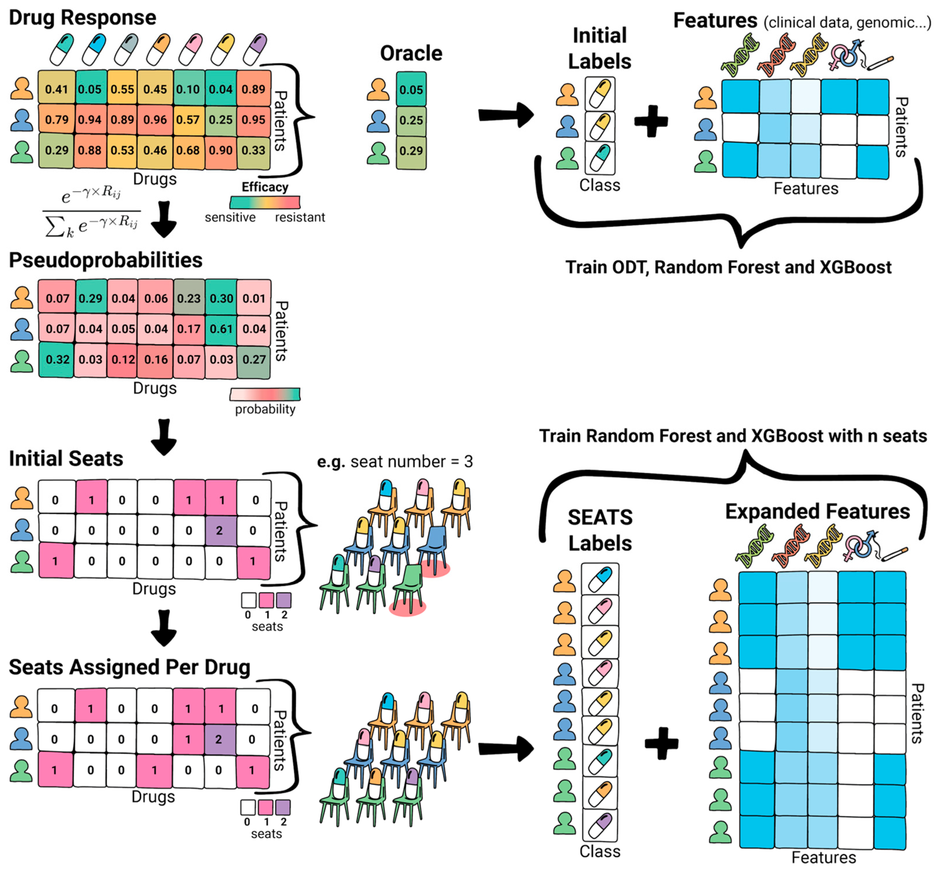 The final allocation determines the expanded training labels. For instance, if a patient assigns two seats to Drug A and one to Drug B, the dataset is expanded with three rows—two labeled as Drug A and one as Drug B. This expanded dataset is then used to train the RF and XGBoost models, effectively emphasizing drugs with partial efficacy while preserving the best-performing drug as the dominant signal. Tuning γ and the number of seats allows SEATS to control the granularity of the drug selection process, enabling more personalized and robust drug recommendation strategies.