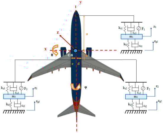 In the full aircraft model, the fuselage body or sprung mass is free to roll and pitch. The sprung mass is attached to the three unsprung masses (nose, left and right main landing gears) and they move vertically concerning the sprung mass [7]. The mathematical model of the full 6-degree-of-freedom aircraft model with an active damper is given in Figure 1. In this model, z, θ, and φ are the vertical displacement, pitch and roll movements of the fuselage, z1, z2 and z3 nose, left and right main landing-gear displacements, a; distance of the nose landing gear from the aircraft’s center of gravity, b; the distance of the center of gravity from the main landing gears, d; distance from the center of gravity of the left main landing gear, e; shows the distance of the right main landing gear to the center of gravity. It should be noted that the model is defined with respect to the static equilibrium configuration, in which the weight of the aircraft is balanced by the static deflections of the landing-gear elements. Accordingly, the vibration responses presented represent deviations from this equilibrium state, ensuring that the analysis is performed around realistic operating points.