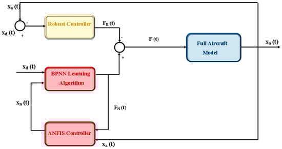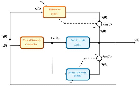 Model-based neural networks can provide more accurate prediction and control performance with less data compared to purely data-driven methods. Additionally, its ability to generalize, which inherently incorporates system dynamics, is higher. This network structure combines the system’s analytical model and experimental data. The input layer contains system variables, the hidden layers contain nonlinear activation functions and unknown dynamics, and the output layer contains the system response [17,18]. In the learning process, the error function was updated using the backpropagation algorithm for network weights, drawing from both the measured data and model-based constraints. Figure 2 presents the model-based neural network control scheme. Here, the figure consists of 4 blocks. These are listed as the full aircraft model, neural network controller, reference model, and neural network model.