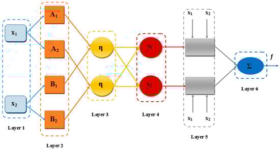 In this context, Ai and Bi represent fuzzy membership sets, while qi denotes the quantity of membership functions. The design parameter, ri, is established during the training process. The structure of a six-layer ANFIS is illustrated in Figure 3. The ANFIS architecture is composed of six distinct layers: