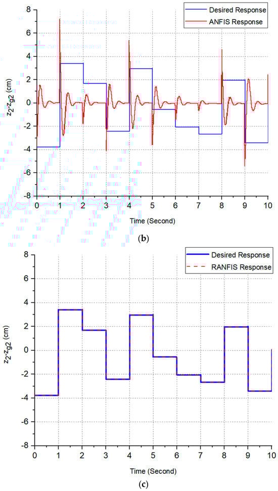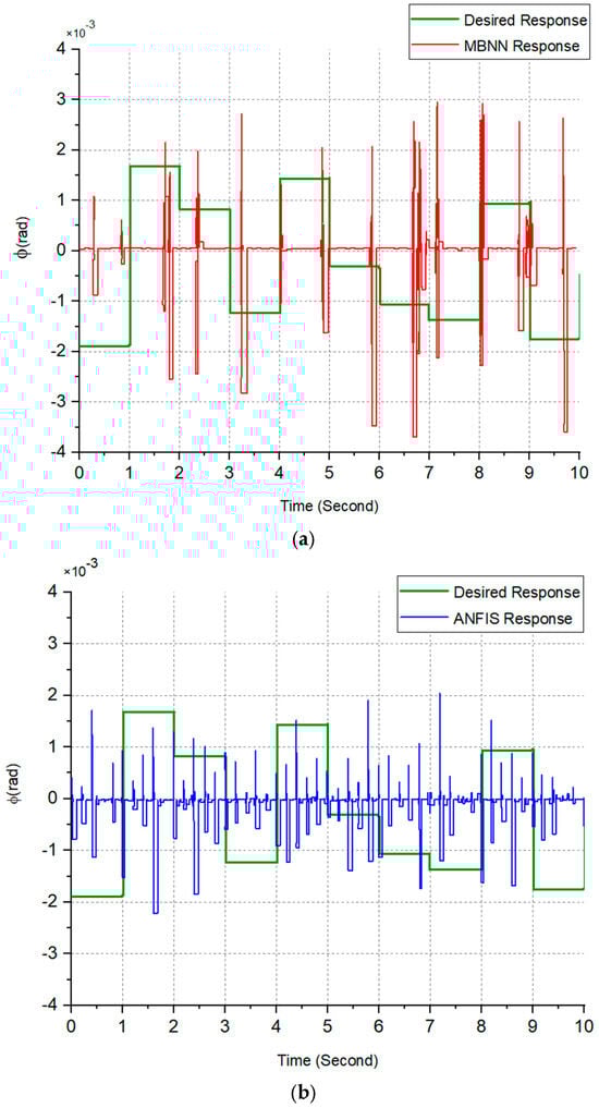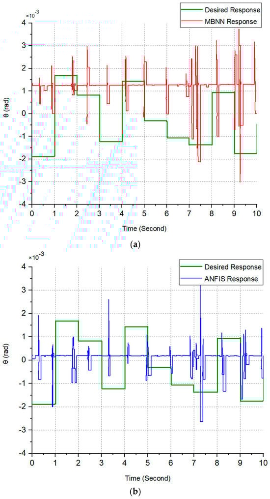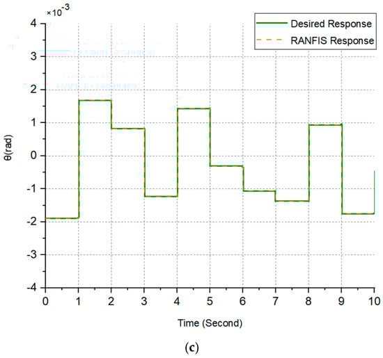 Figure 5 shows the MBNN-based approach, which exhibits high-amplitude oscillations with a peak value of approximately ±0.003 rad and a steady-state error of 0.008 rad. Due to a settling time exceeding 5 s, it demonstrates unstable behavior. The ANFIS method, on the other hand, showed better performance with a peak value of ±0.002 rad and an error of 0.004 rad, but the settling time of approximately 3.5 s indicates that the vibrations could not be completely suppressed. In contrast, the RANFIS approach achieved the highest success with a low peak value of ±0.001 rad, a rise time of less than 0.1 s, and a settling time of less than 1 s; it reduced the steady-state error to a negligible level and perfectly tracked the desired reference response.