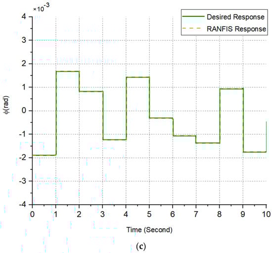 When the simulation findings obtained from the roll direction in Figure 6 are evaluated with numerical performance parameters, the differences between the methods become clearly apparent. The MBNN-based control approach produced the highest overshoot value with a peak value of approximately 0.0032 rad, and despite a rise time of around 0.5 s and a peak time of 0.8 s, it exhibited a settling time longer than 5 s. Additionally, the fact that it leaves a steady-state error of approximately 15% indicates that this method exhibits inadequate control performance in the roll direction. The ANFIS method, on the other hand, reduced the peak value to 0.002 rad, with a rise time of 0.4 s, a peak time of around 0.7 s, and stabilization achieved within approximately 3.5 s. The reduction in the steady-state error to 7% proves that this represents a significant improvement compared to the MBNN. On the other hand, the robust adaptive neuro-fuzzy inference system (RANFIS) method reached a minimum peak value of 0.001 rad, providing a rapid response with a rise time of only 0.3 s and a peak time of 0.5 s. The system settling and becoming stable within approximately 1.2 s, and the steady-state error dropping to a level of 1–2%, clearly demonstrates the superiority of this method in suppressing vibrations in the roll direction.