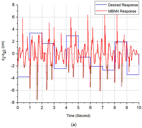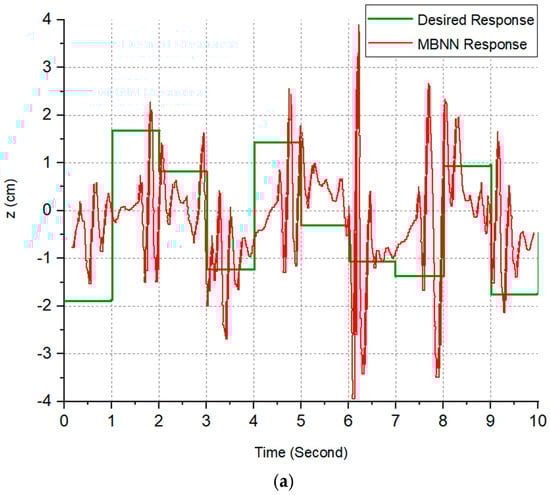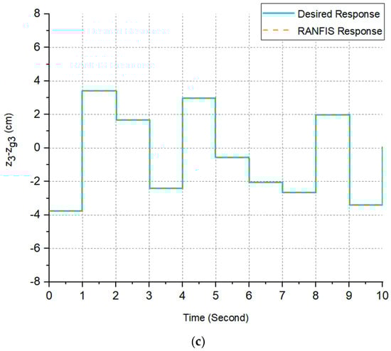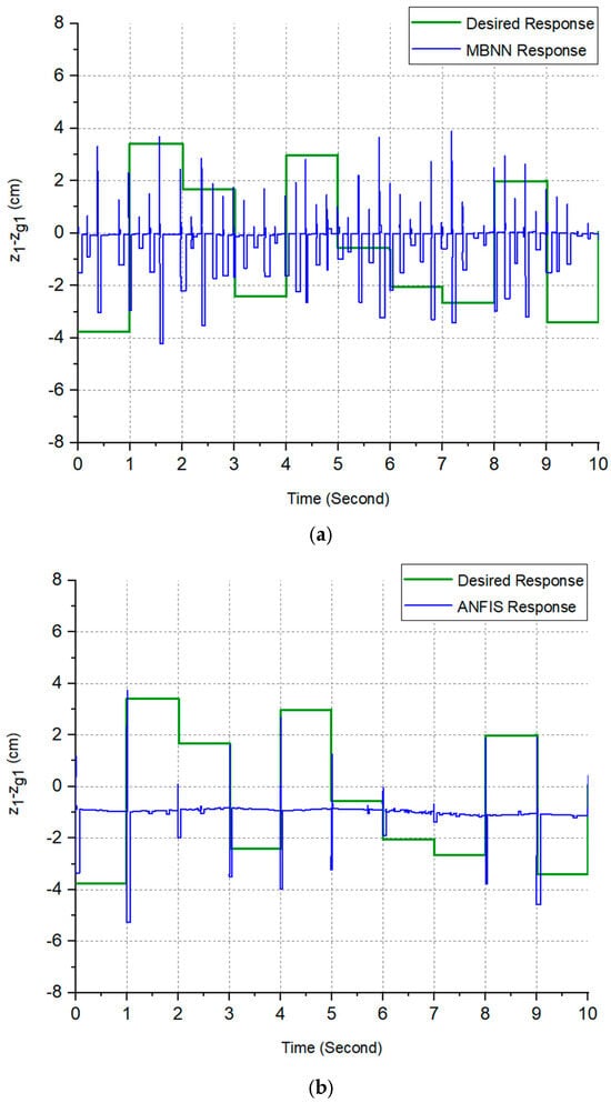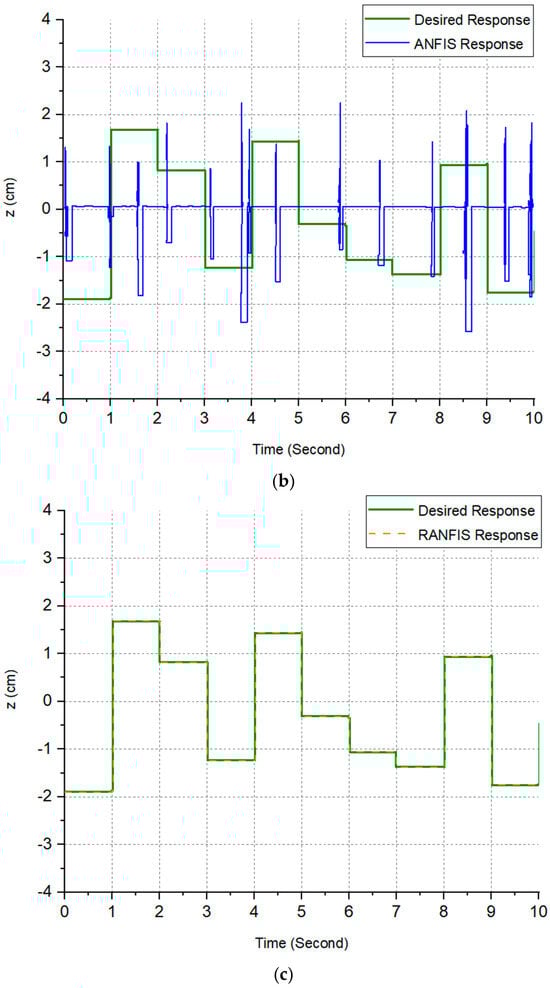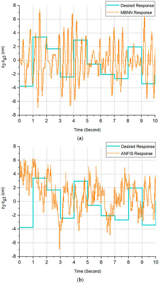 As seen in Figure 9, for the vertical displacement of the right rear landing gear, the MBNN produced a significant overshoot with a peak value of approximately 7.8 cm, showing a rise of 0.55 s and a peak time around 0.90 s; the settling time exceeds 5 s, and the steady-state error remains at approximately −0.8 cm negative offset. In ANFIS, the peak value decreases to around 6 cm; the rise time is approximately 0.40 s, the peak time is around 0.70 s; the settling time is in the range of 3 s, and the steady-state error is approximately −1.0 cm. RANFIS, on the other hand, follows the reference almost flawlessly in practice: the peak is below 0.3 cm, the rise is around 0.22 s, the peak time is 0.35 s, the settling time is less than 1.1 s, and the steady-state error is below 0.05 cm, close to zero. Considering that the rear landing gear carries the majority of the aircraft’s load, this table confirms RANFIS’s clear leadership in terms of energy damping capacity and comfort metrics.