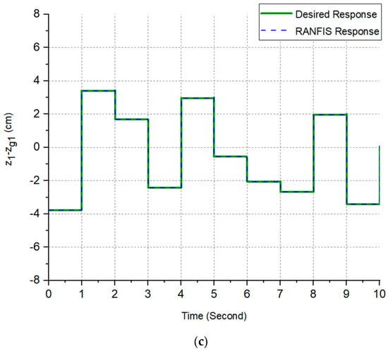 As shown in Figure 8, the MBNN method produced high-amplitude oscillations; the peak value was 7.0 cm, the peak time was 8.3 s, the rise time was 0.50 s, the settling time was over 5.0 s, and the steady-state error was −0.6 cm. With ANFIS, the peak value was 4.2 cm, the peak time was 9.0 s, the rise time was 0.35 s, the settling time was 3.2 s, and the steady-state error was −1.0 cm. RANFIS, on the other hand, tracked the reference almost flawlessly; the peak value was obtained as 0.25 cm, the peak time as 0.35 s, the rise time as 0.20 s, the settling time as 0.90 s, and the steady-state error as less than 0.05 cm. These metrics clearly show that RANFIS provides a significantly superior control performance in terms of vibration suppression and comfort in the nose landing gear.