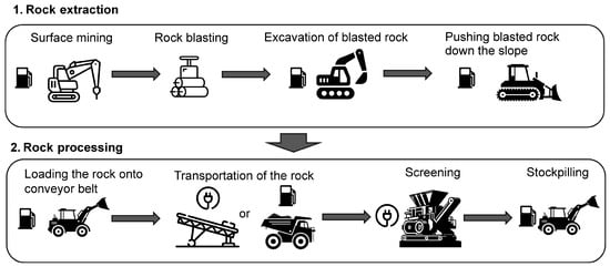The system boundaries encompass the extraction and processing of rock, corresponding to modules A1–A3, as defined in [] (Figure 1). The aggregates in the quarry are extracted from the dolomite bedrock. The extraction process begins with drilling holes in the rock to place explosives, which are then used to blast the bedrock into fragments. These fragments are excavated using an excavator and pushed down the slope by a bulldozer. A loader transfers the rock fragments onto a conveyor belt, which transports them to a nearby screening plant located approximately 400 m away. At the plant, the rock is screened using various mesh sizes to separate it into different fractions, including filler, fine aggregates (such as sand), and coarse aggregates (such as gravel). Finally, the aggregates are stockpiled according to size and prepared for delivery to customers for use in various construction projects. Washing and drying are not performed, as the produced aggregates meet the technical requirements for their intended applications. However, these additional processes may be introduced in the future to reduce the content of the finest fractions and enhance the quality of natural aggregates for concrete.