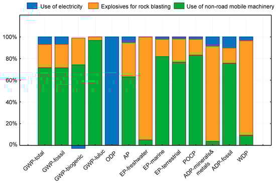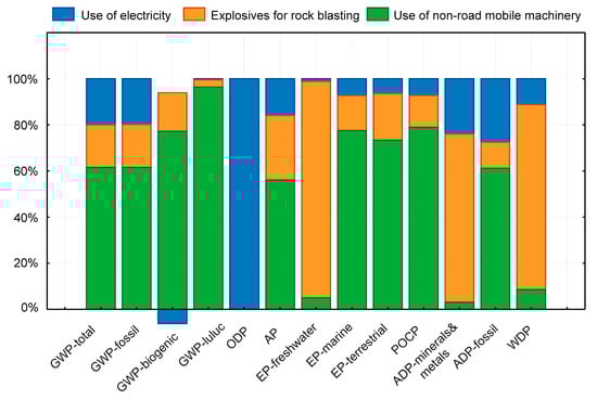 As shown in Figure 2 and Figure 3, the non-road mobile machinery contributes the most to the environmental footprint of natural aggregates in most impact categories. In terms of some impact categories, the environmental hotspot is related to the use of explosives to blast the bedrock (eutrophication of freshwater, water depletion potential, and abiotic depletion of minerals and metals). The effects on these environmental parameters arise upstream, during the production of explosives. The environmental impacts associated with electricity consumption significantly predominate in terms of their potential to deplete the ozone layer. Electricity generated by photovoltaic (PV) solar systems has a relatively high impact on ozone layer depletion potential, approximately 40 times greater than the electricity supplied by the Slovenian grid. This elevated impact primarily originates from the upstream manufacturing processes of PV systems, particularly the production of aluminum frames [].