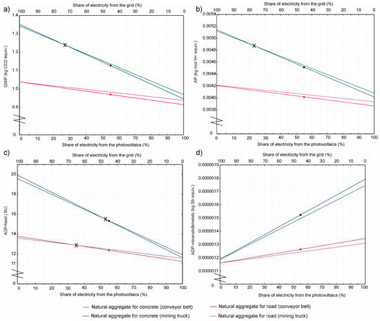 Sensitivity analysis showing how different proportions of electricity sources affect the environmental footprint of the natural aggregates. (a) Impact on GWP; (b) impact on acidification; (c) impact on abiotic depletion of fossil fuels; and (d) impact on abiotic depletion of minerals and metals. Two scenarios were considered, differing in the mode of transportation for the blasted rock fragments. The dots represent the environmental impact of the aggregates, based on the actual electricity mix (55% solar energy and 45% grid mix). “X” marks the share of electricity allocated to powering the conveyor belt, resulting in equal environmental impact across both scenarios. For more details, see Appendix B.