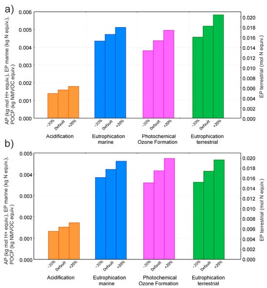 A sensitivity analysis was conducted for regulated emissions (NOx, CO, hydrocarbons, and particulate matter) from non-road mobile machinery [], assuming a ±20% variation (Figure 5). The results show that these emissions influence the following categories: acidification potential, marine eutrophication potential, terrestrial eutrophication potential, and photochemical ozone formation potential (Figure 5). They do not affect the other nine core impact categories. The sensitivity analysis revealed that a ±20% change in regulated emissions affects acidification potential by ±8%, and marine eutrophication, terrestrial eutrophication, and photochemical ozone formation potentials by 12–13%, based on a cradle-to-gate LCA of natural aggregates for concrete. For natural aggregates used in road construction, environmental performance is slightly more sensitive to ±20% variations in regulated emissions, with acidification potential changing by ±9%, and eutrophication (marine and terrestrial) and photochemical ozone formation potentials by 13–14%. See also Appendix A (Table A3 and Table A4).