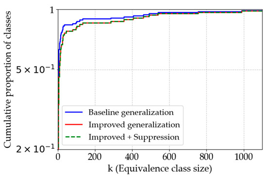 Figure 2 and Table 3 summarize equivalence class distributions under the three de-identification strategies. The baseline strategy produced the lowest cumulative curve, reflecting a high proportion of small classes. Enhanced generalization shifted the curve upward. Combined generalization with suppression strategy produced the highest curve, indicating an overall increase in larger classes.