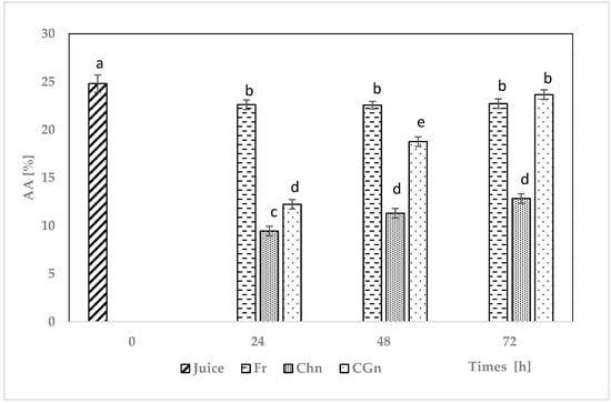 | Grapefruit juice | 63.21 ± 2.61 a | 3.07 ± 0.12 a | 0.94 ± 0.12 a | n.d. | 12.00 ± 1.18 ad |