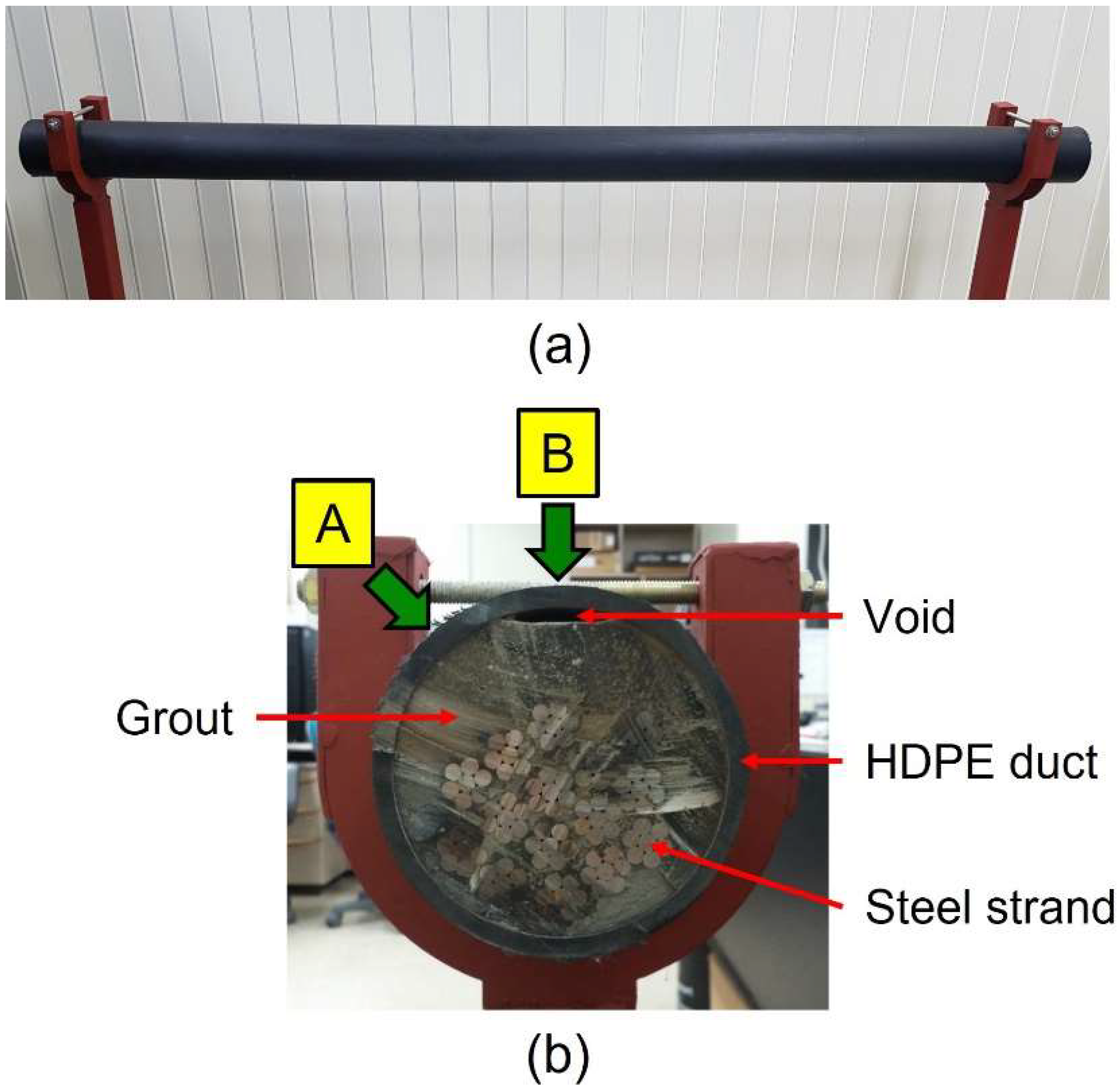 8]. The sounding inspection method involves striking the outer surface of the duct with an impactor and interpreting the resulting sound based on the expertise of the technician. While this method is quick and simple, it is not effective for detecting smaller voids. Ultrasonic testing, on the other hand, utilizes probes that emit and receive ultrasonic waves. Various techniques, including through-transmission, pulse-echo, guided waves, and linear array, are employed, depending on the ultrasonic mode and probe configuration. A key challenge in ultrasonic testing is maintaining proper coupling between the duct and the probe by using a liquid couplant, which can complicate void imaging and sizing. Electromagnetic wave-based methods, such as infrared thermography and radiography, offer high-resolution imaging capabilities for void detection [