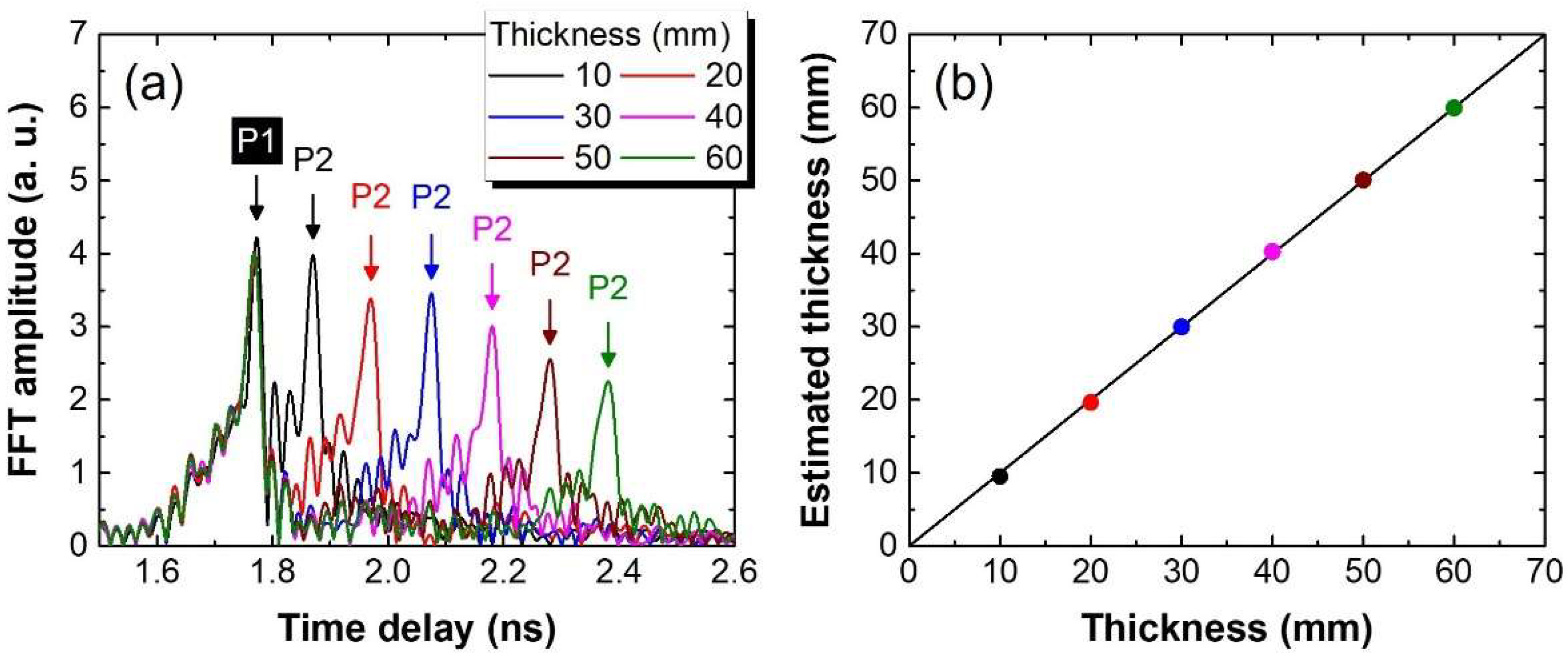Before conducting measurements on the external tendon specimen using the D-band THz A-scanner, we measured the refractive index of HDPE. For this purpose, THz A-scan measurements were performed for HDPE blocks with thicknesses of 10, 20, 30, 40, 50, and 60 mm.