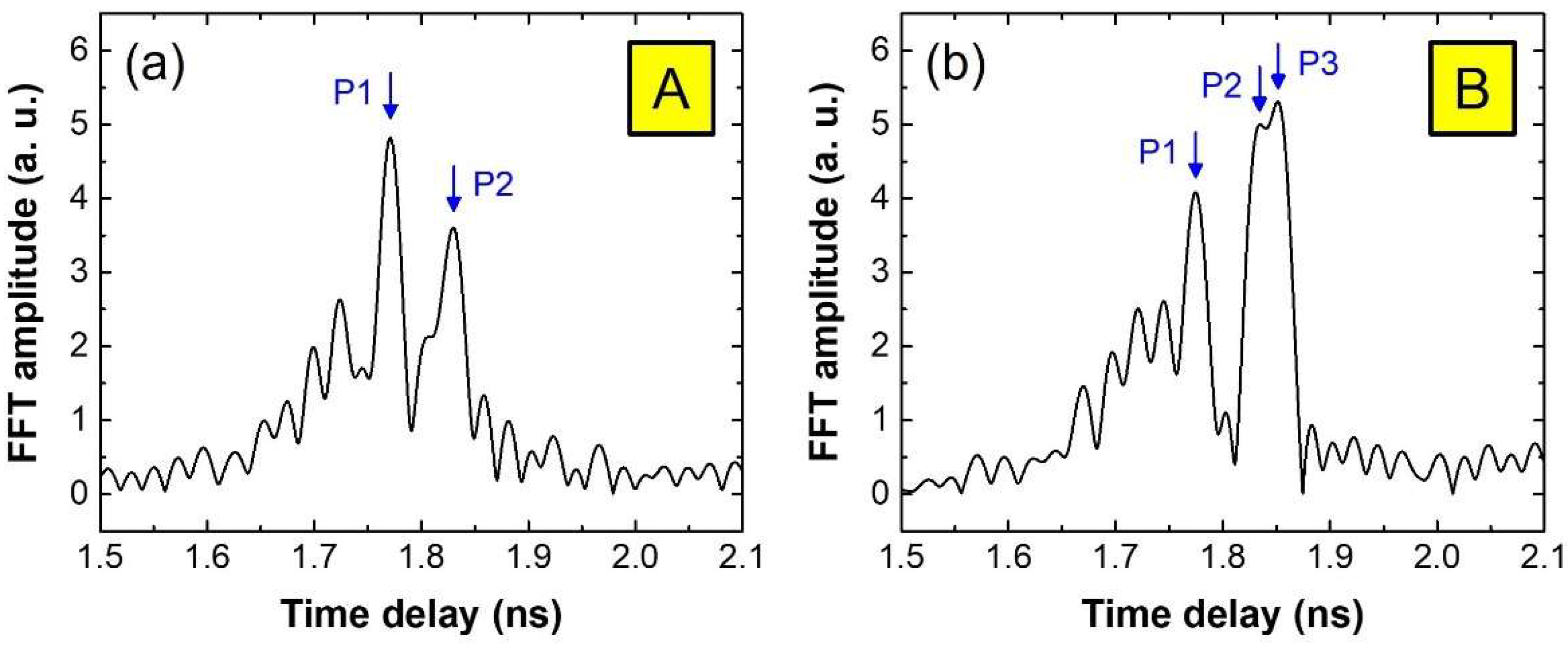 Figure 8b shows the corresponding THz A-scan data, which was derived from the frequency-domain data using FFT. Unlike the time-domain data in