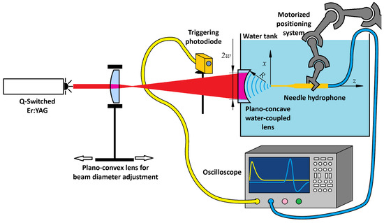 The developed mechanically Q-switched Er:YAG laser system was employed for the generation of focused pressure waves on the experimental setup as shown in Figure 1. The Q-switched Er:YAG laser beam output was directed through a plano-convex lens, allowing for controlled adjustment of the beam diameter at the location of the plano-concave water-coupled lens. This configuration established a spherically concave OA water layer at the interface, leading to the formation of a focused pressure wave. The resulting pressure wave propagated through the water medium, with their characteristics influenced by the laser fluence, beam diameter, and optical focusing geometry. The pressure field was measured by scanning the needle hydrophone in both the axial z and lateral x directions to capture pressure signal variations with respect to the beam diameter (2w, 1/e2 intensity diameter). The focal position was defined as the origin of the coordinate system (see Figure 1). Time-domain waveforms were acquired at each position, allowing for quantitative characterization of the compression and rarefaction phases of the optoacoustic pressure waves.