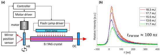 Mechanically Q-switched (MQS) Er:YAG laser system. (a) Schematic of the laser setup, illustrating the synchronized triggering of the flashlamp based on a mirror position sensor composed of a laser pointer and a photodiode. The controller processes this signal to precisely activate flashlamp according to the motor’s rotational speed. The high-reflective (HR) mirror mounted on the rotating motor permits lasing of the Er:YAG crystal only when HR is aligned with the output coupler (OC). The rotational axis and arrows indicate the mirror’s motion. (b) Temporal profiles of MQS Er:YAG pulses (~100 ns FWHM) recorded at several output energies, illustrating the evolution of pulse characteristics with increasing energy.