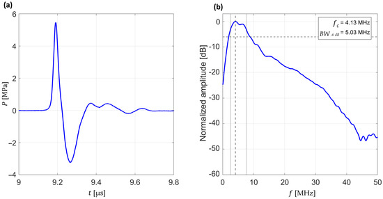Typical measurement of a generated pressure waveform and its frequency-domain spectrum. (a) Typical time-domain pressure waveform acquired with a needle hydrophone, showing the compression (positive peak pressure) and rarefaction (negative peak pressure) phases of the wave. (b) Frequency-domain spectrum obtained by Fast Fourier Transform (FFT) of the same waveform, normalized to the maximum amplitude and expressed in decibels (dB), with extracted central frequency (fc) and −6 dB bandwidth (BW−6 dB). Dashed horizontal line indicates the −6 dB level, whereas dashed vertical line indicates the central frequency.