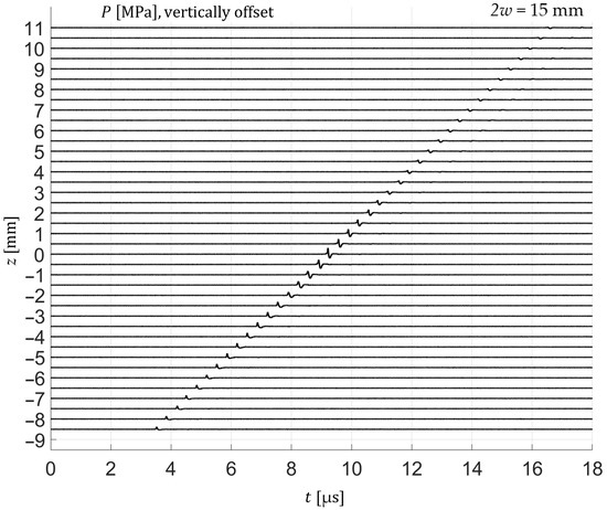 Axial stack of time-windowed pressure waveforms (2w = 15 mm), acquired with a needle hydrophone at successive axial positions (z). The systematic propagation delay of the wavefront with increasing z confirms the expected sound speed in water and illustrates the axial evolution of the focused pressure wave.