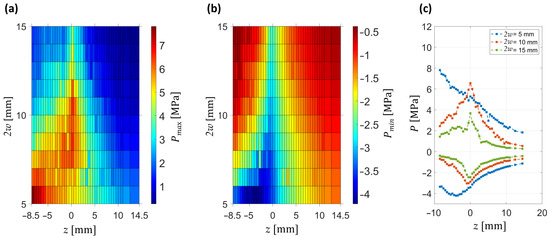 The axial evolution of the pressure field is summarized in Figure 5, which shows the dependence of positive and negative peak pressures on axial position and beam diameter. The maps reveal that the compressional peak Pmax is maximized for an intermediate diameter (2w ≈ 10 mm), where it reaches 7 MPa. In contrast, the rarefactional peak Pmin reaches its largest magnitude −4 MPa already at the smallest diameter (2w = 5 mm). At small diameters (2w ≤ 8 mm), focusing is weak, the positive pressure decreases monotonically with distance, and no well-defined focal region is formed. In contrast, for larger diameters (2w ≥ 12 mm), the pressure distribution narrows, resulting in stronger axial confinement of the pressure field and enhanced positive peak amplitudes at the focal plane.