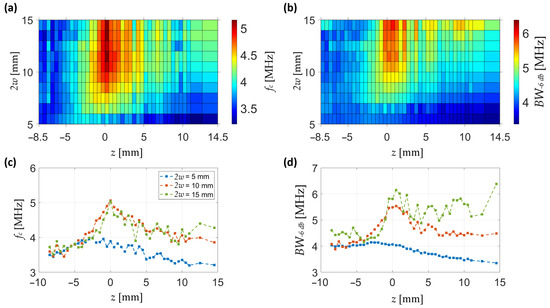Frequency-domain characterization of the pressure field. (a) Spatial map of central frequency as a function of axial position and beam diameter. (b) Spatial map of bandwidth at −6 dB under the same conditions. (c) Axial profiles of central frequency at selected beam diameters (2w = 5, 10, 15 mm). (d) Axial profiles of −6 dB bandwidth at the same beam diameters. Subfigures (c,d) share the same legend.