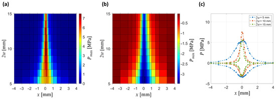 Peak positive and negative pressures as a function of lateral position x and beam diameter. Focus point is located at x = 0 mm. (a) Spatial map of positive peak pressures (Pmax). (b) Spatial map of negative peak pressures (Pmin). (c) Lateral profiles of both positive and negative pressures at selected beam diameters (2w = 5, 10, 15 mm).