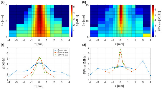 Frequency-domain characterization of the pressure field. (a) Spatial map of central frequency as a function of lateral position x and beam diameter. (b) Spatial map of bandwidth at −6 dB under the same conditions. (c) Lateral profiles of central frequency at selected beam diameters (2w = 5, 10, 15 mm). (d) Lateral profiles of −6 dB bandwidth at the same beam diameters. Subfigures (c,d) share the same legend.