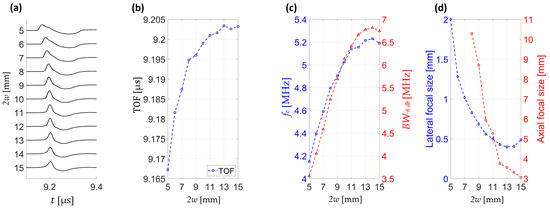 Analysis of pressure wave signals at the acoustic focus (x = 0, z = 0). (a) Pressure waveforms for different beam diameters (2w = 5–15 mm), vertically offset for clarity. (b) Time-of-flight (TOF) of the pressure wave as a function of beam diameter. (c) Central frequency (fc) and −6 dB bandwidth (BW−6 dB) versus beam diameter. (d) Lateral and axial pressure focal size, expressed as full width at half maximum (FWHM) as a function of beam diameter.