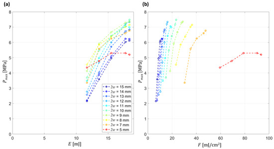 Energy and fluence dependence of peak pressure amplitude (Pmax) for different beam diameters (2w = 5–15 mm). (a) Pmax as a function of pulse energy (E). (b) Pmax as a function of average fluence (F) across the illuminated area. Energies and fluences are referenced to the laser output before the lens. Due to the transmission of the fused-silica lens at 2.94 μm, the actual energy delivered to the water interface is 70–80% of these values, while the peak fluence at the beam center is 140–160% of the average values (F). Subfigures (a,b) share the same legend.