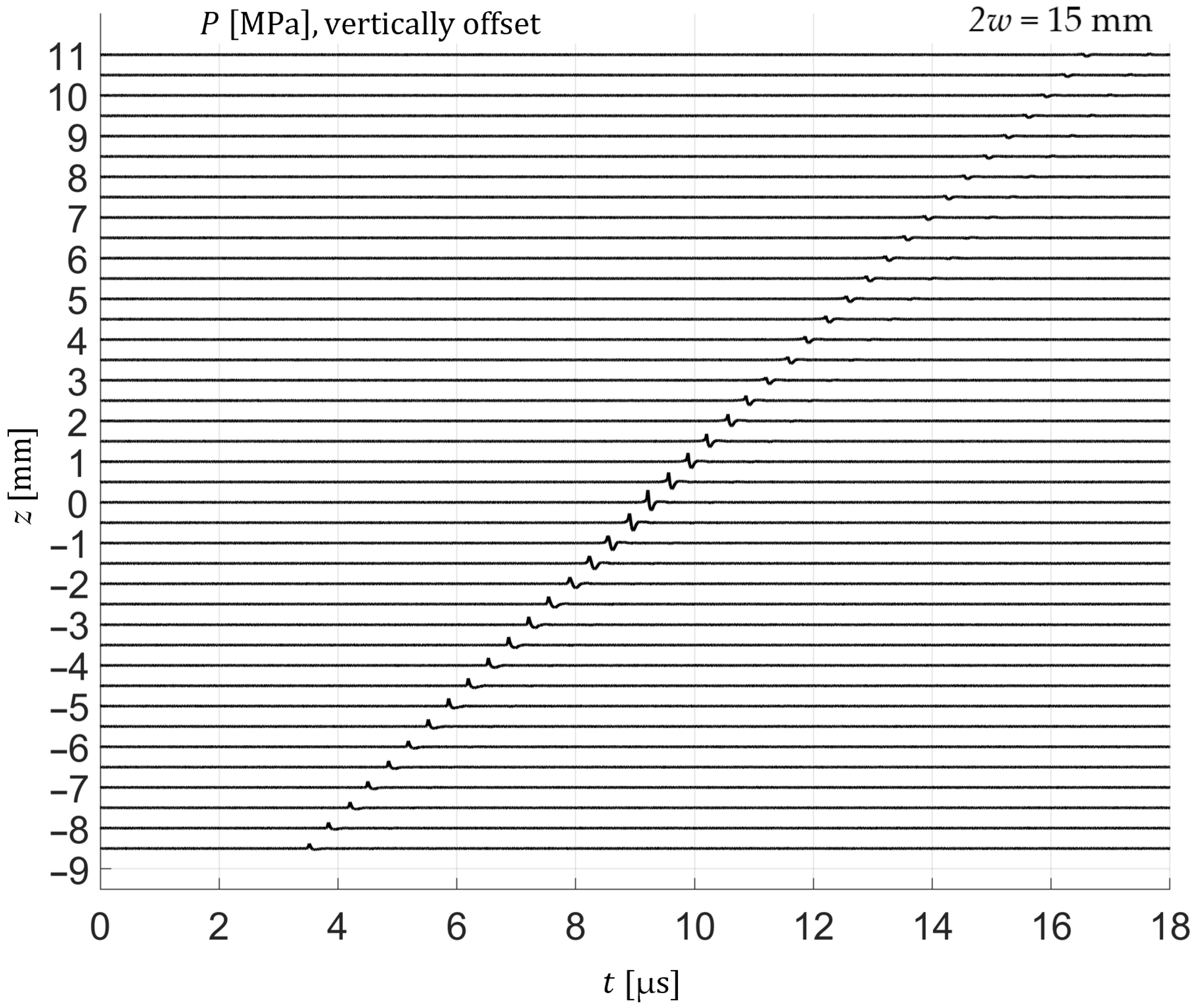 Figure 4. Axial stack of time-windowed pressure waveforms (2w = 15 mm), acquired with a needle hydrophone at successive axial positions (z). The systematic propagation delay of the wavefront with increasing z confirms the expected sound speed in water and illustrates the axial evolution of the focused pressure wave.