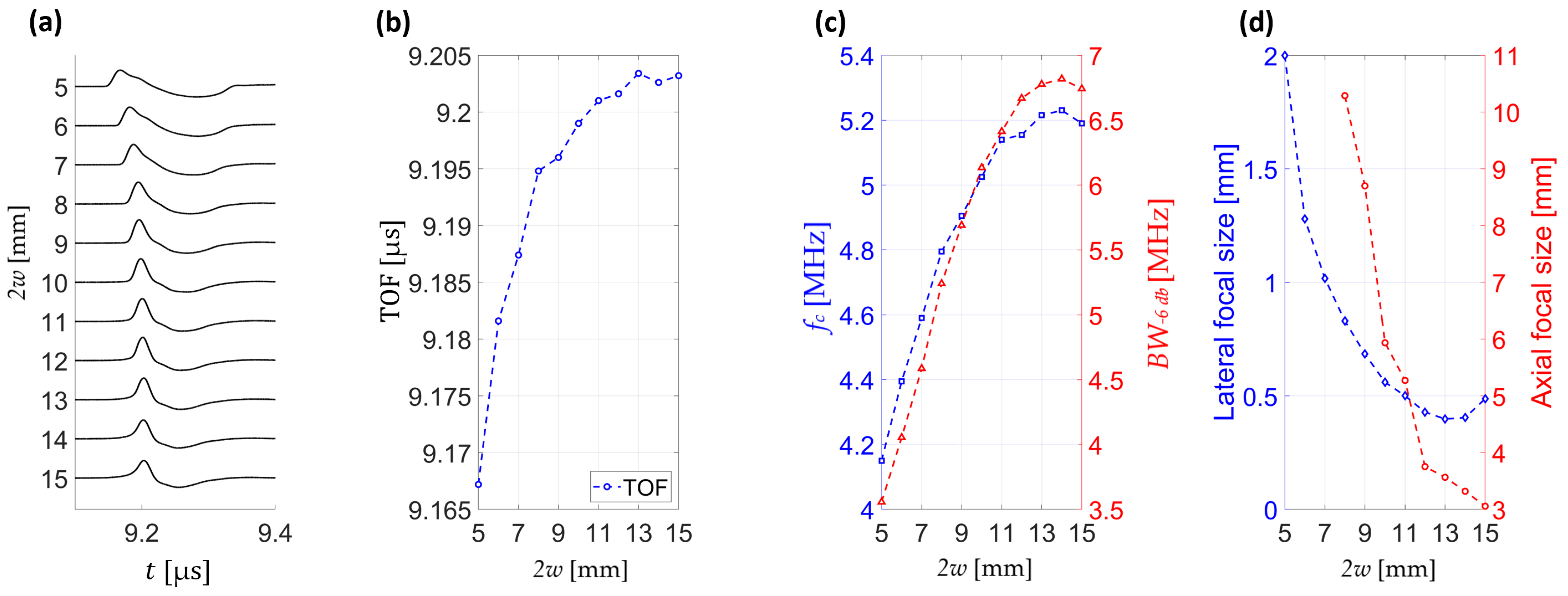 Figure 9. Analysis of pressure wave signals at the acoustic focus (x = 0, z = 0). (a) Pressure waveforms for different beam diameters (2w = 5–15 mm), vertically offset for clarity. (b) Time-of-flight (TOF) of the pressure wave as a function of beam diameter. (c) Central frequency (fc) and −6 dB bandwidth (BW−6 dB) versus beam diameter. (d) Lateral and axial pressure focal size, expressed as full width at half maximum (FWHM) as a function of beam diameter.