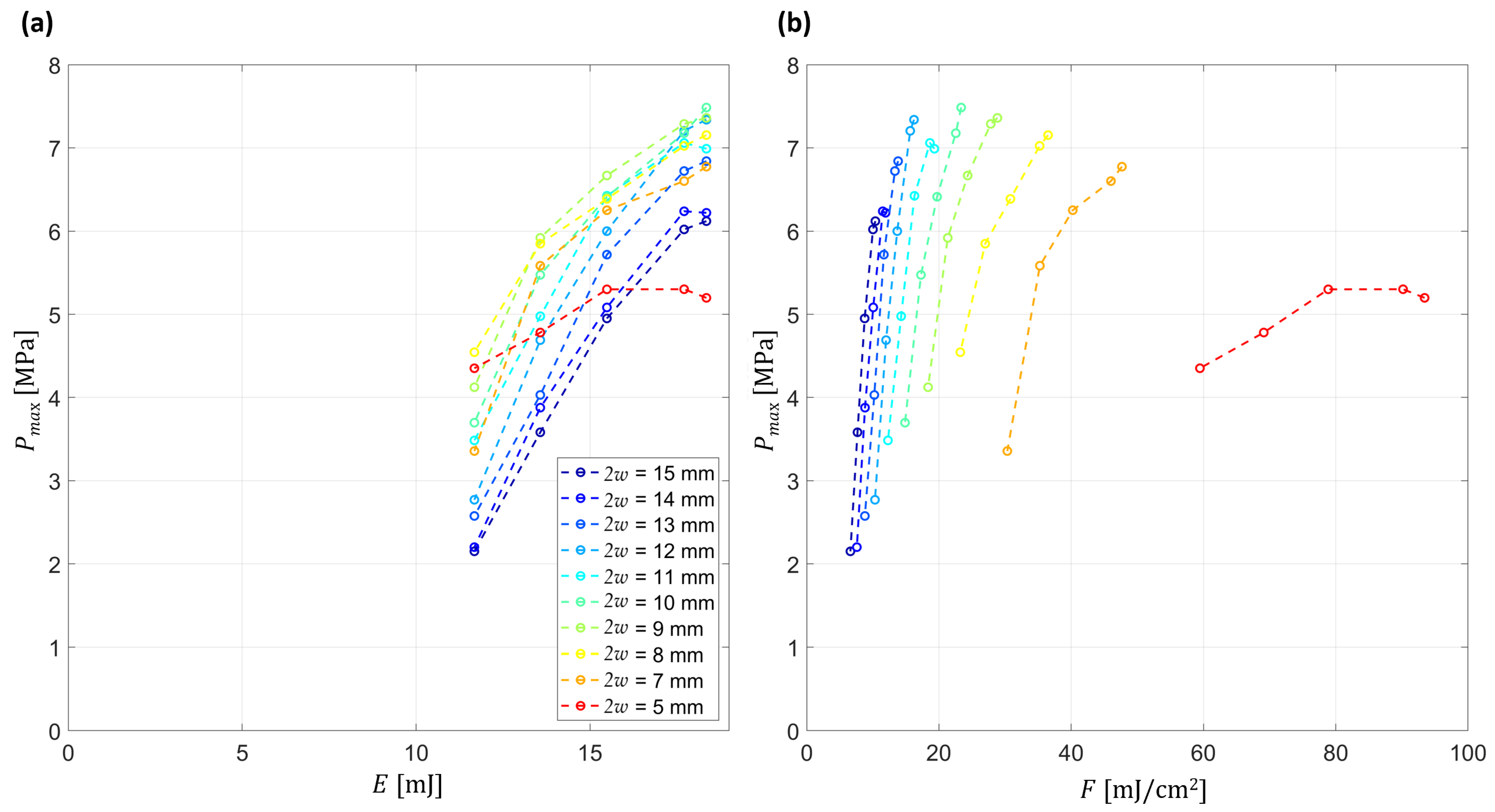 Figure 10. Energy and fluence dependence of peak pressure amplitude (Pmax) for different beam diameters (2w = 5–15 mm). (a) Pmax as a function of pulse energy (E). (b) Pmax as a function of average fluence (F) across the illuminated area. Energies and fluences are referenced to the laser output before the lens. Due to the transmission of the fused-silica lens at 2.94 μm, the actual energy delivered to the water interface is 70–80% of these values, while the peak fluence at the beam center is 140–160% of the average values (F). Subfigures (a,b) share the same legend.