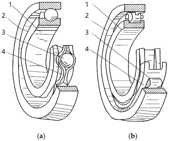 Rolling bearing structure. (a) Deep groove ball bearing. (b) Cylindrical roller bearing. 1—inner ring; 2—outer ring; 3—rolling elements; 4—cage.
