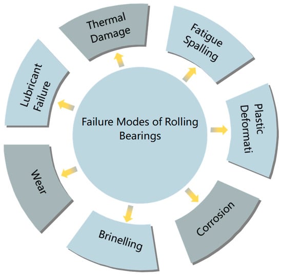 Summarizing common failure modes and analyzing the core causes of these failures is an important step in bearing fault detection. The common failure modes of rolling bearings, as also presented in Figure 2, include the following: