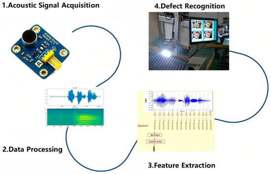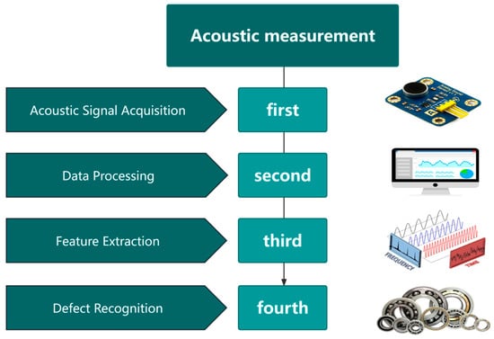 Acoustic analysis, as an important supplement to vibration analysis methods [31], utilizes high-frequency acoustic signals to detect small defects and early faults. Similar to vibration analysis, acoustic characteristics such as the frequency and amplitude of the emitted sound waves vary depending on the failure mode and fault location of the bearing [32]. The sound wave signal is also highly susceptible to environmental noise interference, but due to its ability to collect high-frequency signals, it can eliminate low-frequency noise interference. The principle of acoustic analysis is shown in Figure 4.