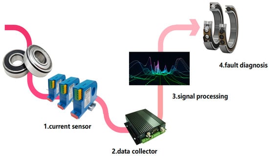 Current analysis, as one of the supplementary methods of vibration analysis [45,46], is often used for fault diagnosis of motor bearings [47]. Similar to the previous two methods, the failure mode and fault location of the bearing are different, and the frequency spectrum of the current generated is also different, which can be used for diagnosis. The principle of current analysis is shown in Figure 5.