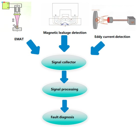 The electromagnetic acoustic transducer (EMAT) is a non-contact detection technology that generates sound waves through the interaction between electromagnetic fields and material surfaces. It can detect defects on metal surfaces and sub surfaces without physical contact and is widely used for fault detection of bearings and other mechanical components. Compared with traditional ultrasonic testing, EMAT has stronger adaptability to surface contamination and complex shapes, especially suitable for high-temperature environments and hard-to-reach places. Guo Y designed a new type of electromagnetic–acoustic transducer and pulsed eddy current composite sensor. The amplitude of the bottom echo recorded by EMAT is used to identify tiny bottom cracks, as well as the amplitude of the pulsed eddy current signal picked up by the integrated symmetry coil. The signal fusion method can accurately correct the amplitude of the defective signal with a relative error of less than ±8% [53].