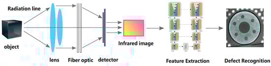 Infrared thermography, as a non-contact detection technology that does not damage the properties of bearings, is a fault diagnosis technology that determines the health status of bearings by monitoring the temperature field distribution and thermal changes of bearings [54]. The principle is shown in Figure 7.