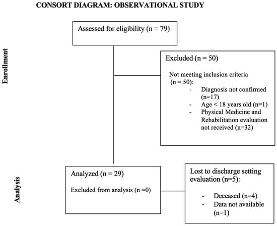 Discharge settings could be defined for 24 out of 29 patients (due to 4 deaths and one case of missing data). Among these, 14 subjects (58.34%) were discharged home, 6 (25%) were transferred to other departments or community hospitals, with 2 awaiting potential transfer to a rehabilitation facility, and 4 (16.67%) were transferred to rehabilitation facilities.
