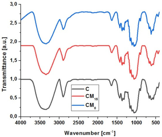 The structure of the pristine cellulose and composites was first assessed by infrared spectroscopy. Infrared spectra of pristine cellulose (C) and CM0 and CM15 composite samples are shown in Figure 1.