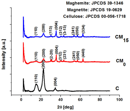 XRD patterns for pristine cellulose (C) and ferromagnetic composites (CM0 and CM15).
