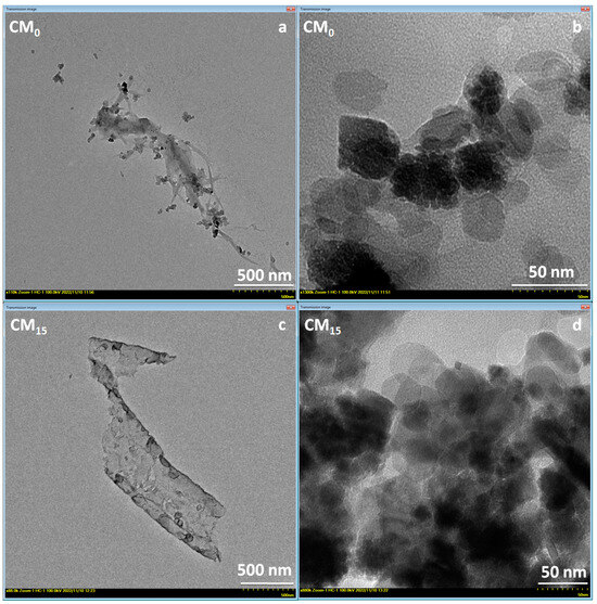 Agglomerations of roughly spherical particles (magnetite and maghemite) distributed relatively evenly on the cellulose fibers are readily visible with regard to the composites. As the SEM images of magnetite and maghemite particles are not conclusive, the CM0 and CM15 composites were analyzed by TEM (on a smaller scale) (Figure 4).