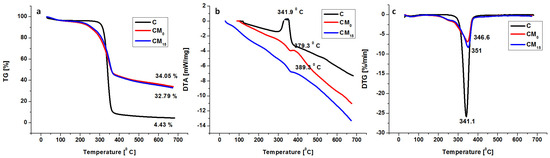 Thermal degradation (TG) of the precursors and magnetic composites (Figure 5a) was achieved in the inert gas atmosphere (He) with a flow of 40 mL/min, a heating rate of 10 °C/min, and a temperature range of 30 to 680 °C. DTG and DTA curves for C, CM0, and CM15 are shown in Figure 5b,c. Table 7 displays the weight loss and important thermal characteristics derived from thermal degradation.
