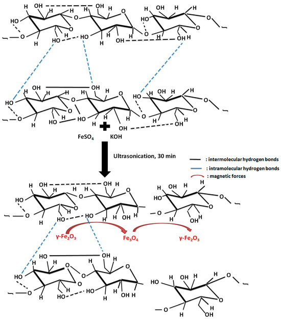 It is evident from the WPPF weight fraction study that magnetite and maghemite are components of both cellulosic composites. With the exception of temperature, the coprecipitation synthesis of magnetite and maghemite is the same. For magnetite, temperatures above 90 degrees are required for the complete conversion of the iron salt. Maghemite can be synthesized at temperatures below 80 degrees. It also contains iron oxyhydroxides such as goethite, lepidocrocite, or akaganeite but at room temperature (20–25 °C) [5,8]. In contrast to partial in situ synthesis (CM15), where the temperature ultimately reaches 87 °C, in total, during situ synthesis (CM0), part of the energy of the ultrasonic waves is also absorbed by the cellulose, resulting in a maximum reaction medium temperature of 71 °C. Maghemite and magnetite are present in approximately equal amounts (12.5% and 12.9%) in the CM15 composite. Another direct effect of this ultrasonic synthesis method is found in the degradation of the crystalline structure of the cellulose. The crystallinity index CrI dropped from 73% to 36% and 38%, respectively, for the two composites. This phenomenon was in agreement with other studies [9]. In accordance with the data obtained by X-ray diffraction, we propose the following reaction schemes for the two syntheses.