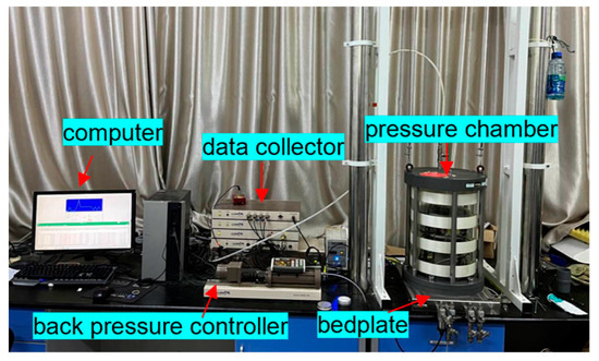 For this experiment, the GDSRCA resonant column testing system, developed by the British company GDS, was utilized. The testing system includes a computer, a data acquisition unit, a backpressure controller, software-driven components, and signal amplifiers as detailed in reference [26], depicted in Figure 3. The resonant column testing utilizes an electromagnetic drive system to generate sinusoidal vibrations. In torsional experiments, four pairs of coils are connected in series to generate torque acting on the soil specimen. Due to the influence of the magnetic field, the drive disk undergoes oscillatory motion. Adjusting the frequency and amplitude of the applied voltage enables the identification of the resonant frequency of the specimen. The amplitude can be detected by scanning the frequency applied using an accelerometer positioned on the drive disk.